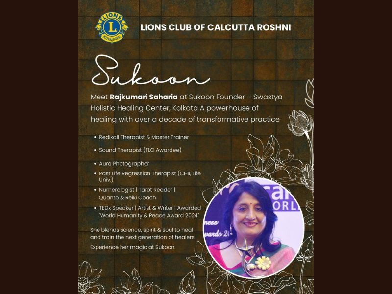 Lions Club of Calcutta Roshni presents Sukoon. Meet Rajkumari Saharia, Founder of Swastya Holistic Healing Center—a powerhouse of healing with over a decade of transformative practice.