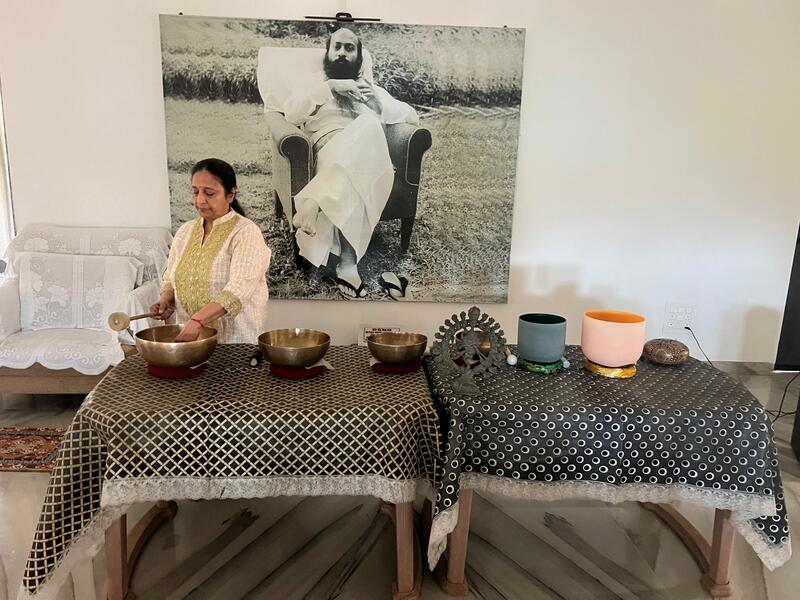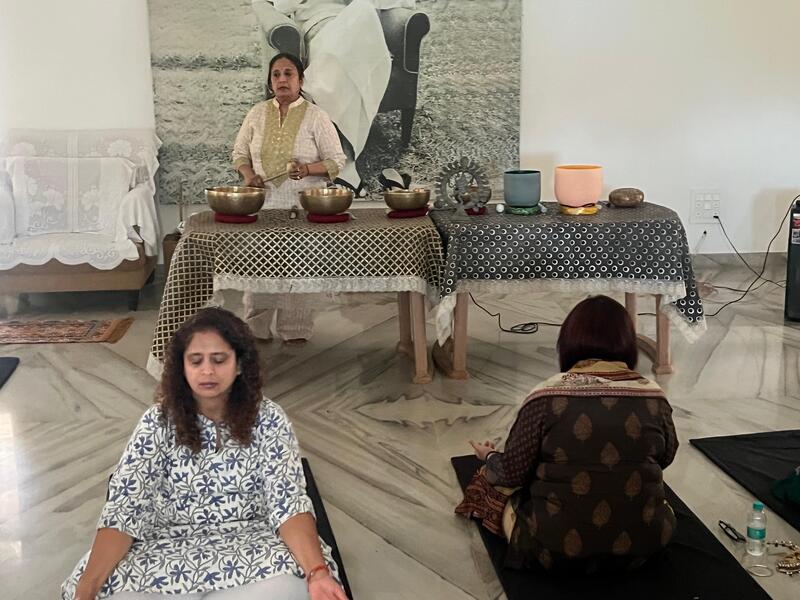 Experience profound sound bath meditation sessions led by the esteemed Rajkumari Saharia.